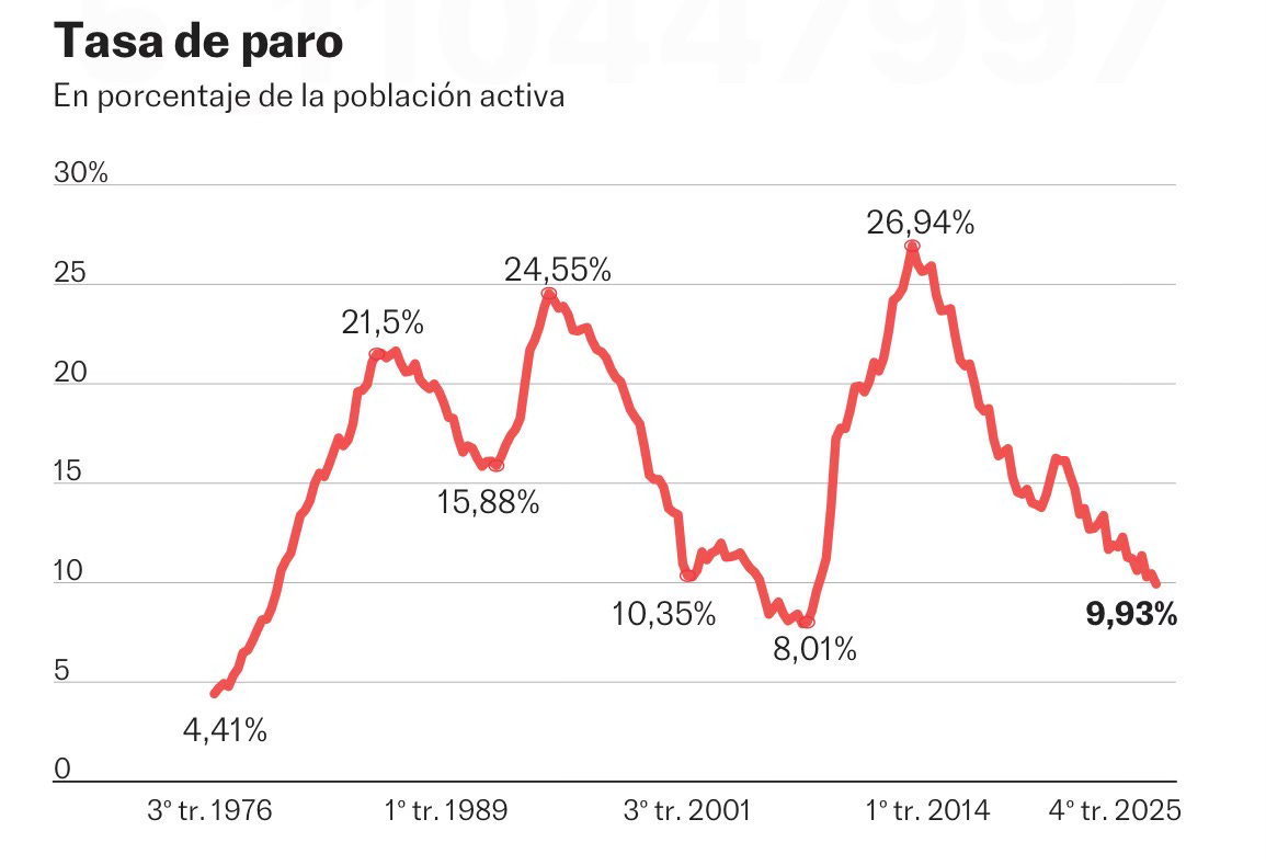 Headline: Spain ended 2025 with an unemployment rate of 9.93% - the first time it has fallen below 10% since 2008.