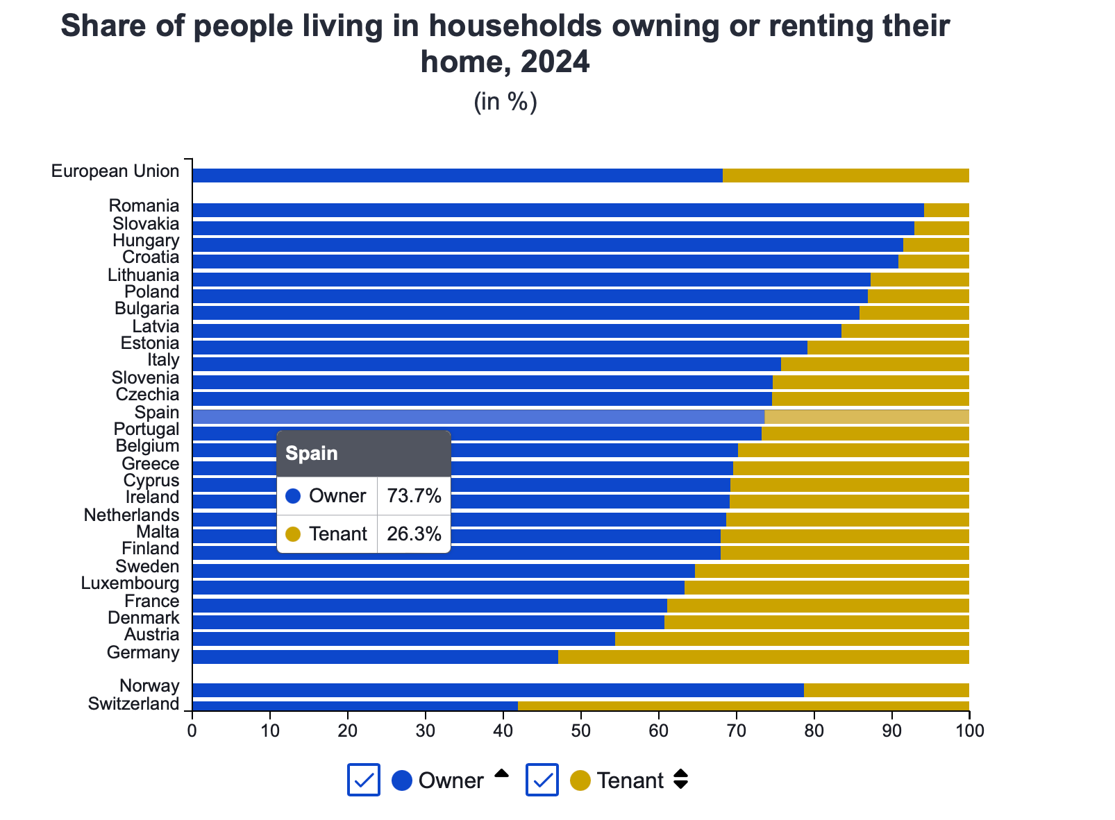 In 2024, homeownership was more common than renting across all EU countries except Germany, where 53% of residents were tenants - more than double Spain’s rate.