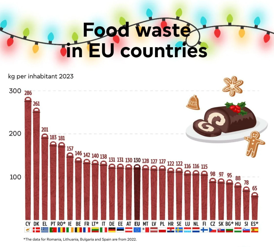 Headline: Spain wastes the least amount of food in the European Union - half the EU average! Dense urban living and easy access to fresh ingredients help.