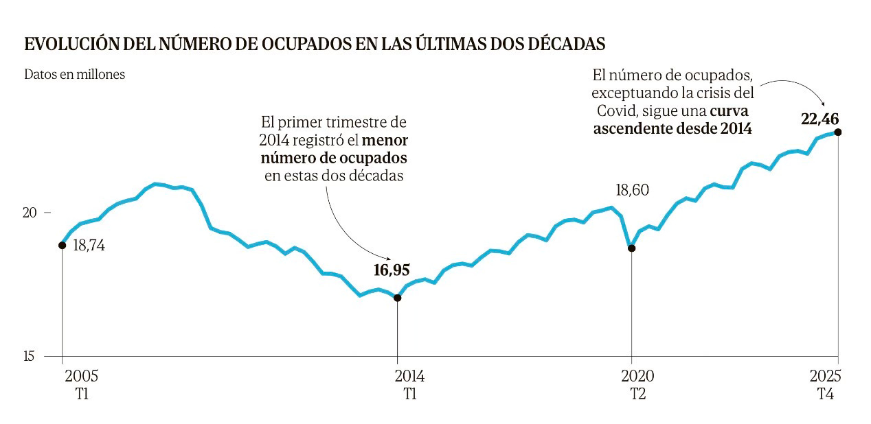 Headline: The number of people in employment in Spain hit a record 22.46 million in 2025, an increase of 605,000 on 2024. Unemployment, meanwhile, fell to 2.47 million.