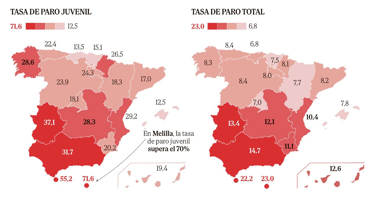 Headline: On the peninsula, Extremadura had the highest youth unemployment in 2025 at 37.1%, while Andalusia recorded the highest overall unemployment at 14.7%.