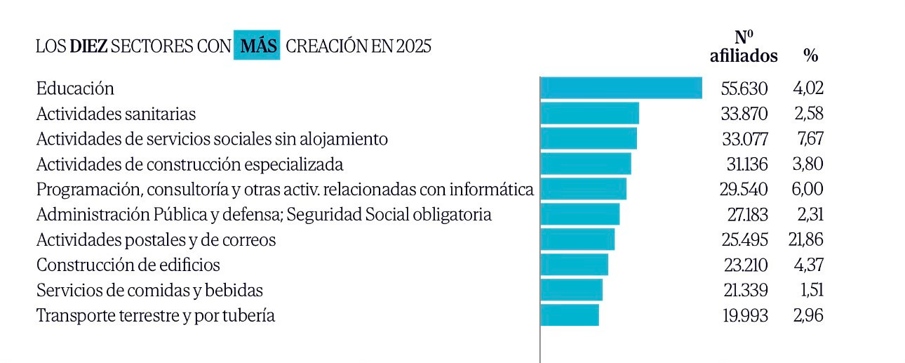 Headline: In 2025, the education sector led job growth in Spain with a 4% increase, followed by healthcare, social services, and specialised construction.