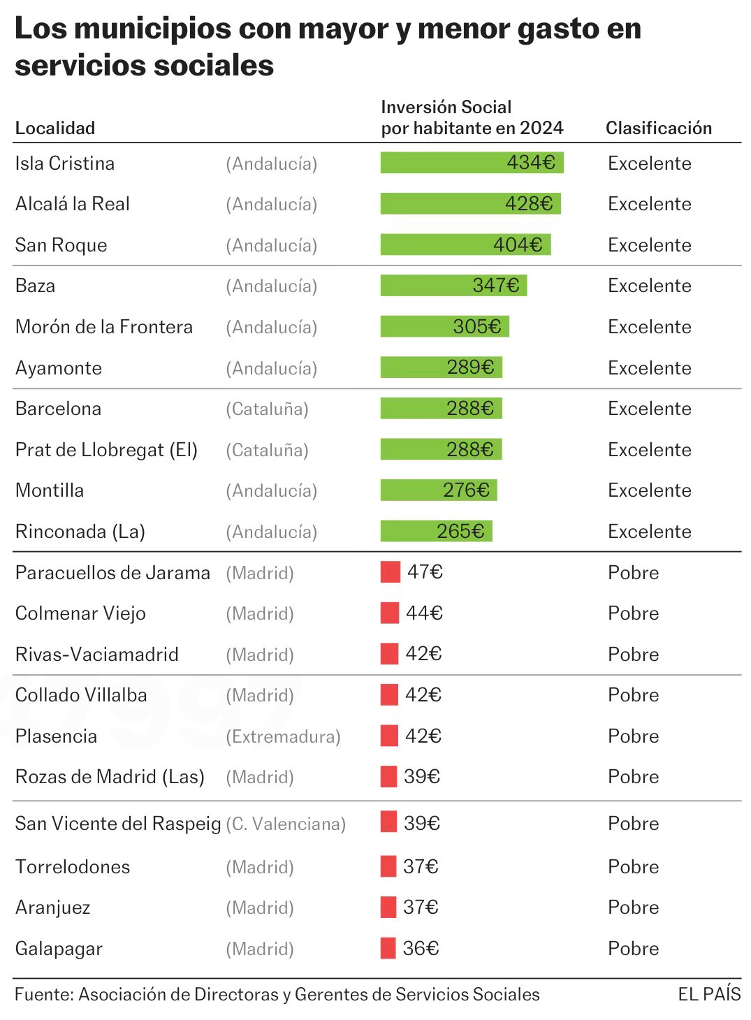 Headline: A study of over 400 Spanish municipalities with more than 20,000 inhabitants found huge disparities in per capita spending on social services in 2024: Isla Cristina (Huelva) led with €434.13 - 12 times higher than bottom-placed Galapagar (Madrid) at €35.89.
