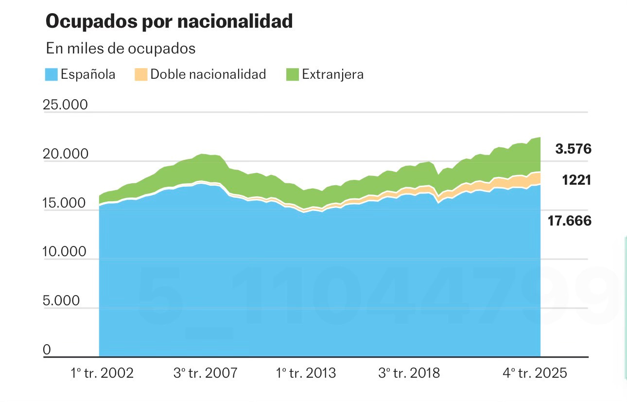 Headline: At the end of 2025, 3.58 million foreigners (me included) and 1.2 million dual nationals accounted for 21.4% of Spain’s workforce - the highest quarterly share on record.
