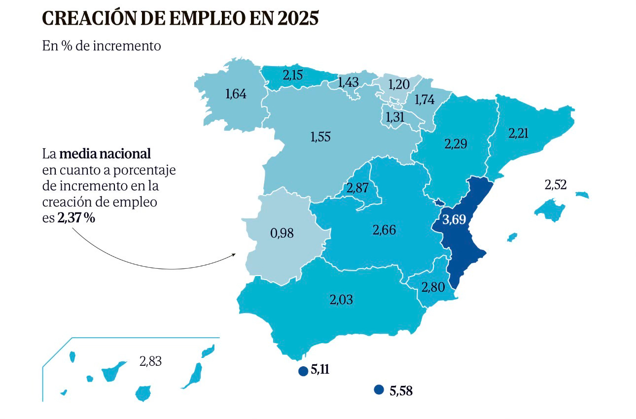 Headline: In 2025, the Valencia region recorded the highest job growth rate (3.69%) on the Spanish peninsula, nearly 57% above the national average (2.37%).